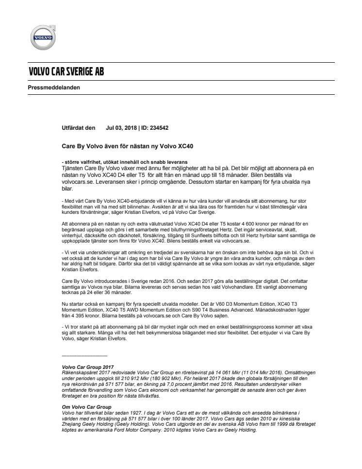 Tjänsten Care By Volvo växer med ännu fler möjligheter att ha bil på. Det blir möjligt att abonnera på en nästan ny Volvo XC40 D4 eller T5 för allt från en månad upp till 18 månader. Bilen beställs via volvocars.se. Leveransen sker i princip omgående. Dessutom startar en kampanj för fyra utvalda nya bilar.
