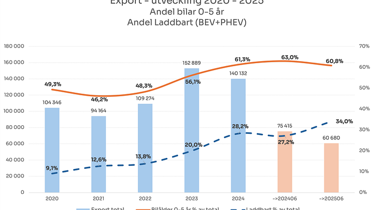 Vrooms analyser visar att det fortsatt är allt yngre bilar som är populära att exportera. Under första halvåret 2025 utgjordes hela 61 % (63 %) av den exporterade personbilsflottan av bilar yngre än fem år. Andelen laddbara bilar i exporten fortsätter att öka och utgjorde under årets första halva 34 % (27 %) av den totala exporterade volymen. För de yngre bilarna med fordonsålder upp till 5 år utgjorde den laddbara andelen hela 54 % (42 %).