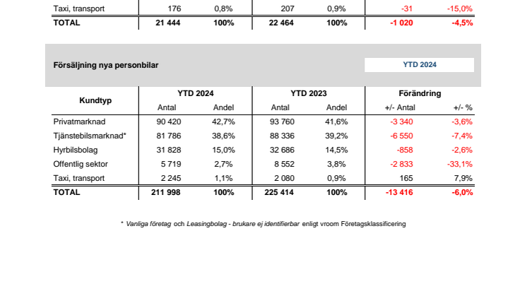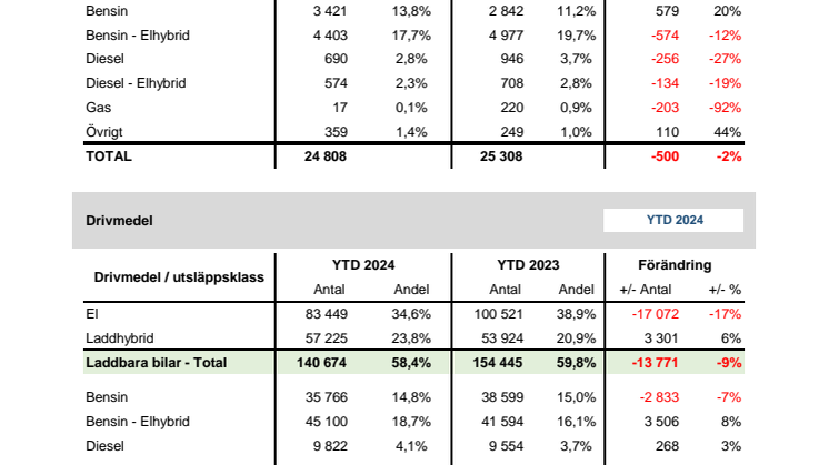 Personbil | 24 808 | -2% | 240 887 | -7% |