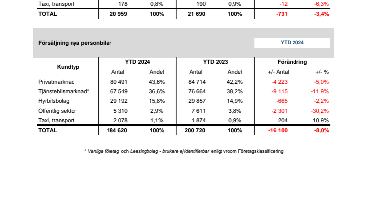 Hittills under 2024 har 184 620 nya personbilar levererats till slutkund vilket är en minskning med 8,0% i jämförelse med samma period 2023.