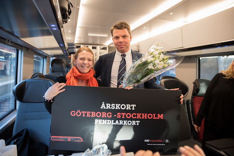 Petra Lundborg gjorde resa 250 000 med MTR Express och gratuleras av VD Johan Söör.