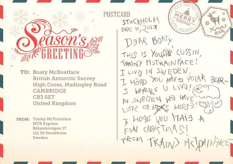 Snow falls in Stockholm and Gothenburg, Christmas lights bright up the cities. Everyone at MTR Express headquarters is feeling the holiday spirit, especially Trainy McTrainface, who this week, sat down and handwrote thoughtful Christmas greetings to its cousins Boaty McBoatface in England and Ferry McFerryface all the way south in Australia.