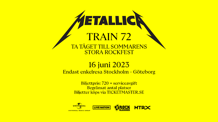 Efter förra årets enorma succé med Iron Maidens Train 666 som tog fansen från Stockholm till Göteborg via ett helt unikt eventtåg återskapar MTRX magin tillsammans med Live Nation - den här gången inför Metallicas efterlängtade konserter på Ullevi. I samarbete med Universal och Rockklassiker kommer Metallicafansen få den ultimata uppladdningen inför Metallica Gothenburg Take Over. Med maxat innehåll, överraskningar, mat och dryck ombord på Train 72 startar rockhelgen så snart tåget lämnar perrongen.