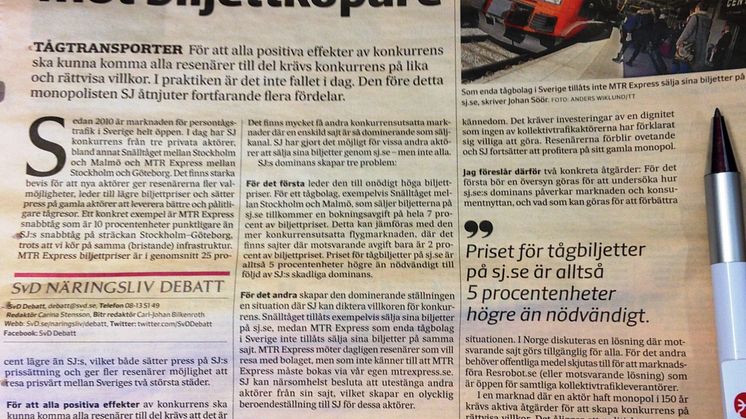 I en debattartikel i Svenska Dagbladet nyligen beskrev MTR Express VD Johan Söör vad som kan göras för att förbättra konkurrensen inom biljettbokning av tågbiljetter.