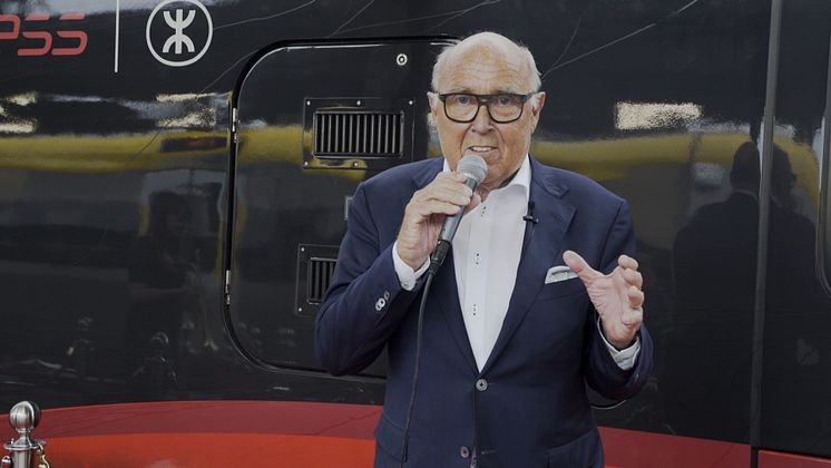 • Ingvar Oldsberg talar vid dopet av MTR Express tåg Ingvar.