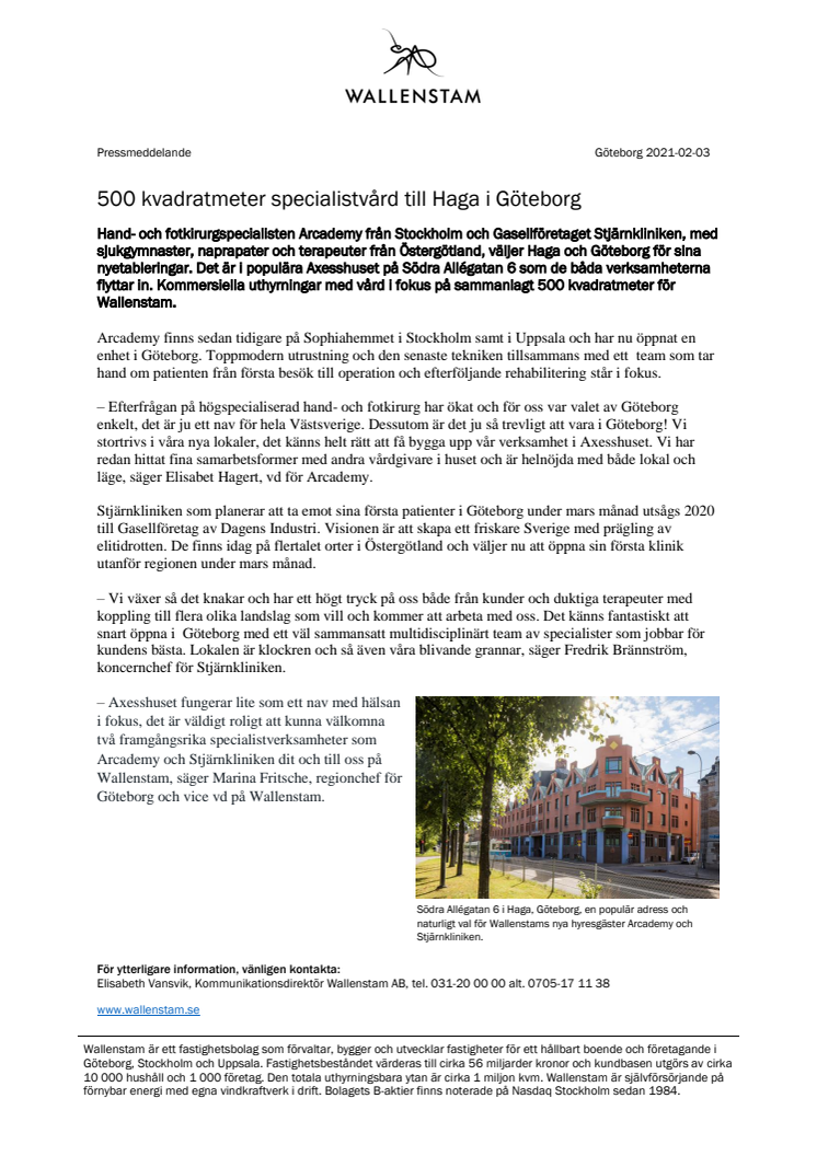 Hand- och fotkirurgspecialisten Arcademy från Stockholm och Gasellföretaget Stjärnkliniken, med sjukgymnaster, naprapater och terapeuter från Östergötland, väljer Haga och Göteborg för sina nyetableringar. Det är i populära Axesshuset på Södra Allégatan 6 som de båda verksamheterna flyttar in. Kommersiella uthyrningar med vård i fokus på sammanlagt 500 kvadratmeter för Wallenstam.
