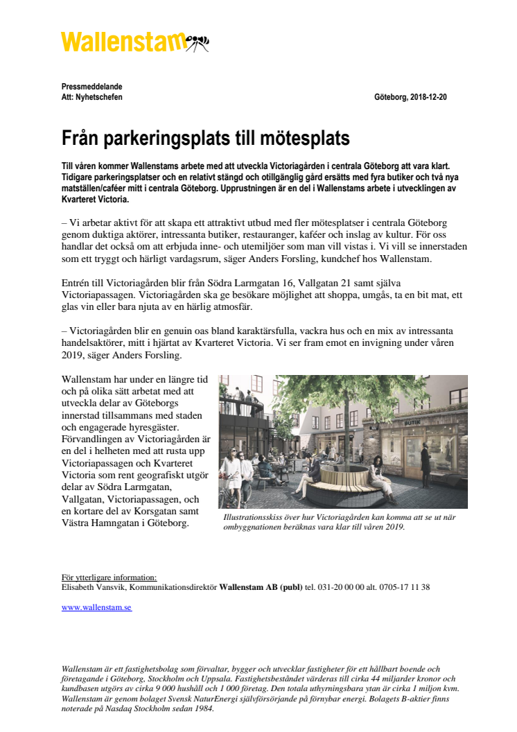 Till våren kommer Wallenstams arbete med att utveckla Victoriagården i centrala Göteborg att vara klart. Tidigare parkeringsplatser och en relativt stängd och otillgänglig gård ersätts med fyra butiker och två nya matställen/caféer mitt i centrala Göteborg. Upprustningen är en del i Wallenstams arbete i utvecklingen av Kvarteret Victoria.