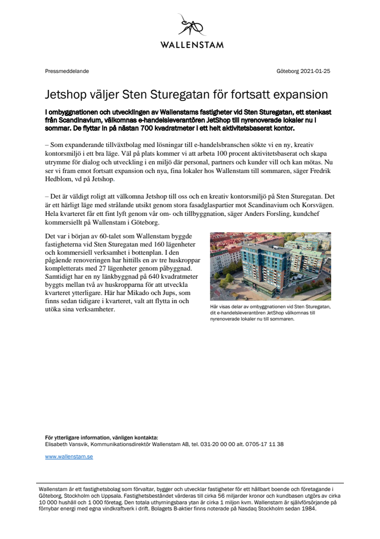 I ombyggnationen och utvecklingen av Wallenstams fastigheter vid Sten Sturegatan, ett stenkast från Scandinavium, välkomnas e-handelsleverantören JetShop till nyrenoverade lokaler nu i sommar. De flyttar in på nästan 700 kvadratmeter i ett helt aktivitetsbaserat kontor.