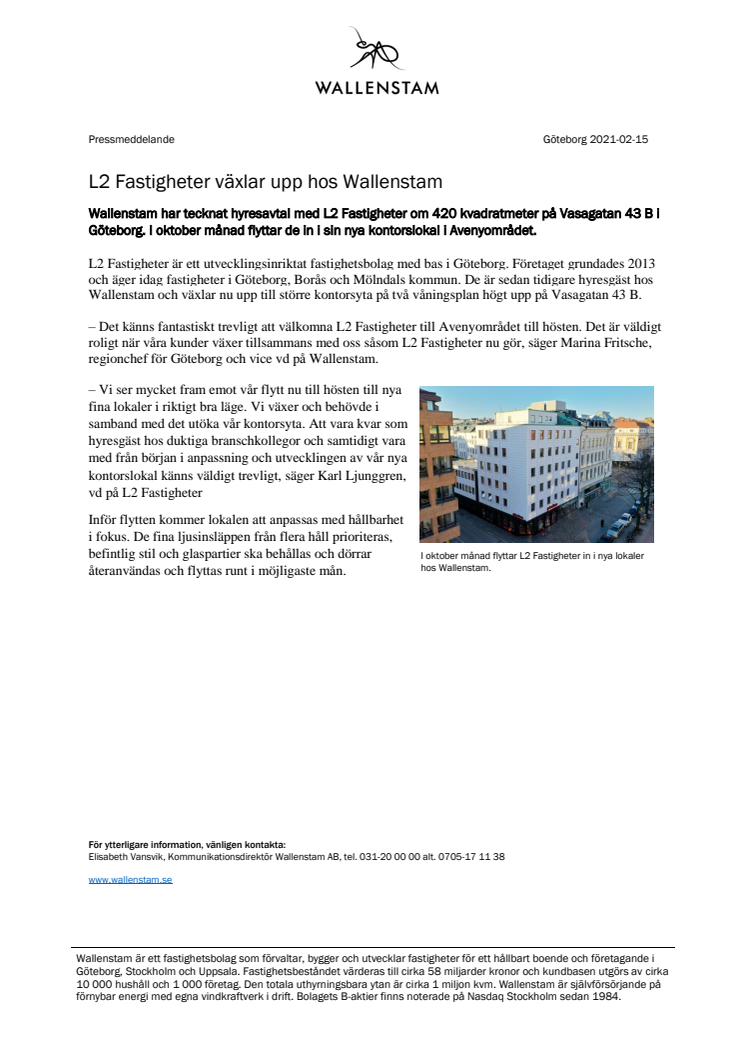 Wallenstam har tecknat hyresavtal med L2 Fastigheter om 420 kvadratmeter på Vasagatan 43 B i Göteborg. I oktober månad flyttar de in i sin nya kontorslokal i Avenyområdet.