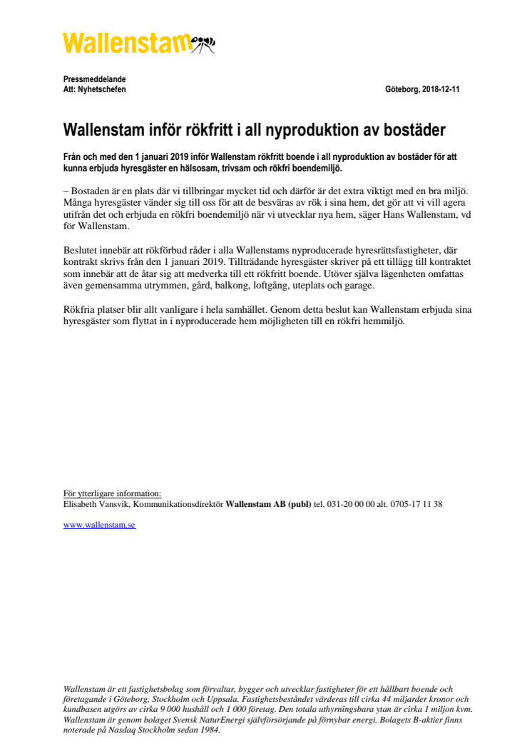Från och med den 1 januari 2019 inför Wallenstam rökfritt boende i all nyproduktion av bostäder för att kunna erbjuda hyresgäster en hälsosam, trivsam och rökfri boendemiljö.