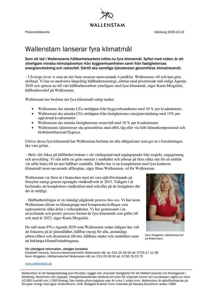 Som ett led i Wallenstams hållbarhetsarbete införs nu fyra klimatmål. Syftet med målen är att ytterligare minska klimatpåverkan från byggverksamheten samt från fastigheternas energianvändning och restavfall. Därtill ska samtliga tjänsteresor genomföras klimatneutralt.