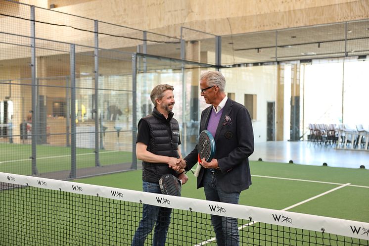 Niklas Evheden, som driver Östermalmshallens padel och Hans Wallenstam, vd för Wallenstam.