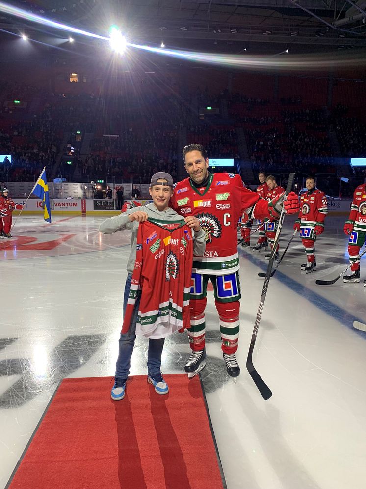 Kvällens matchtröja vanns av vår hyresgäst Josephine som lät sin hockeyintresserade lillebror Theo få ta emot den