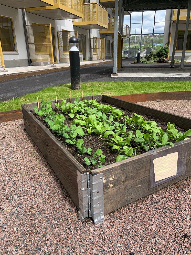 I flera av Wallenstams bostadsområden har bostadshyresgästerna sedan en tid tillbaka haft möjlighet att plantera och odla i odlingslådor i anslutning till sina bostäder. Här är ett exempel från Elisedal i Göteborg.