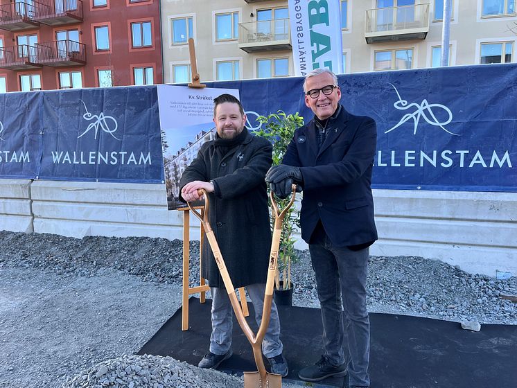 Johannes Hulter, ordförande stadsbyggnadsnämnden i Göteborgs stad, tillsammans med Hans Wallenstam, vd för Wallenstam tog idag första spadtaget för kvarter 1, Stråket i Kallebäcks Terrasser.