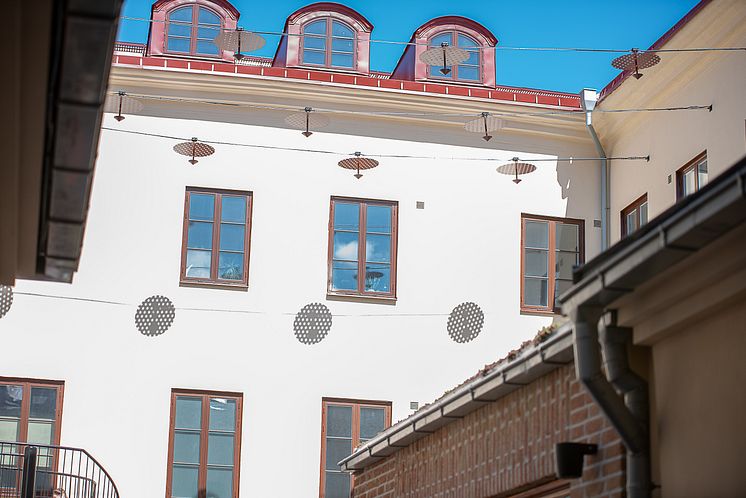 Belysningen på Victoriagården i Göteborg är nominerad till Svenska Ljuspriset. Armaturen på Victoriagården i Göteborg. skapar i solsken ett skuggspel som projiceras på fasaderna.