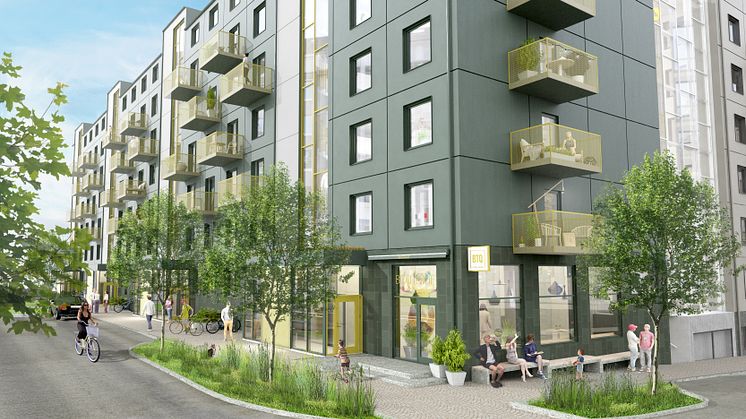 Här välkomnas hyresgäster till lägenheter på 1-4 rum och kök med cykelavstånd till det mesta. De fem husen ramar in en stor gemensam innergård, vilket gör att man som boende kan njuta av både stadslivet och det lugna gårdslivet.