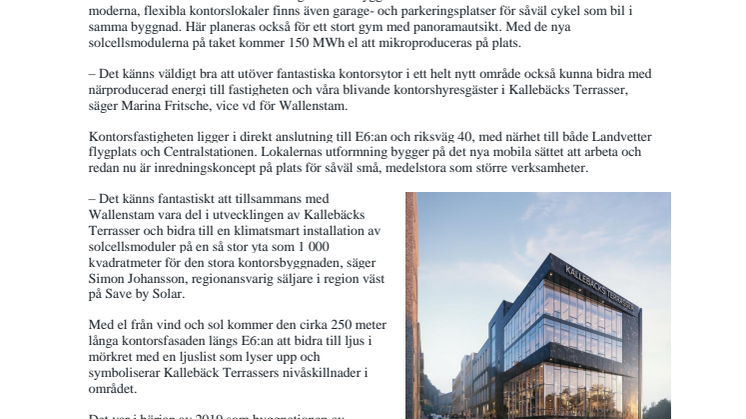 Kallebäcks Terrassers nya stora kontorsbyggnad blir självförsörjande på förnybar energi. Save by Solar ska nu installera 508 solcellsmoduler på byggnadens tak. Egenproducerad vindkraftsel tillsammans med 1 000 kvadratmeter solcellsmoduler bidrar till en klimatsmart vardag för kontorshyresgästerna som flyttar in i slutet av nästa år. Solcellsproduktionen kommer också att generera närproducerad el till laddningsplatserna i fastighetens garage.