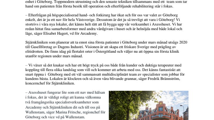 Hand- och fotkirurgspecialisten Arcademy från Stockholm och Gasellföretaget Stjärnkliniken, med sjukgymnaster, naprapater och terapeuter från Östergötland, väljer Haga och Göteborg för sina nyetableringar. Det är i populära Axesshuset på Södra Allégatan 6 som de båda verksamheterna flyttar in. Kommersiella uthyrningar med vård i fokus på sammanlagt 500 kvadratmeter för Wallenstam.