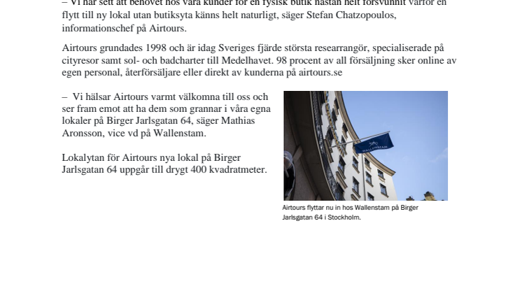 – Vi hälsar Airtours varmt välkomna till oss och ser fram emot att ha dem som grannar i våra egna lokaler på Birger Jarlsgatan 64, säger Mathias Aronsson, vice vd på Wallenstam.