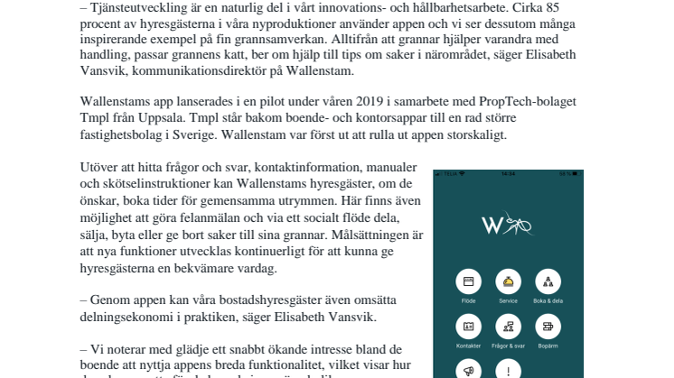 – Tjänsteutveckling är en naturlig del i vårt innovations- och hållbarhetsarbete. Cirka 85 procent av hyresgästerna i våra nyproduktioner använder appen och vi ser dessutom många inspirerande exempel på fin grannsamverkan. Alltifrån att grannar hjälper varandra med handling, passar grannens katt, ber om hjälp till tips om saker i närområdet, säger Elisabeth Vansvik, kommunikationsdirektör på Wallenstam.