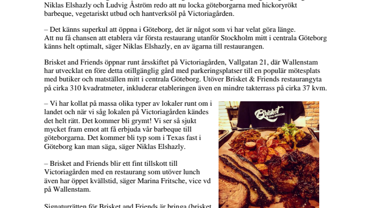 Brisket and Friends öppnar runt årsskiftet på Victoriagården, Vallgatan 21, där Wallenstam har utvecklat en före detta otillgänglig gård med parkeringsplatser till en populär mötesplats med butiker och matställen mitt i centrala Göteborg. Utöver Brisket & Friends restaurangyta på cirka 310 kvadratmeter, inkluderar etableringen även en mindre takterrass på cirka 37 kvm.