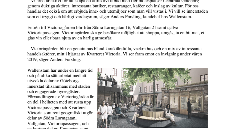 – Victoriagården blir en genuin oas bland karaktärsfulla, vackra hus och en mix av intressanta handelsaktörer, mitt i hjärtat av Kvarteret Victoria. Vi ser fram emot en invigning under våren 2019, säger Anders Forsling.