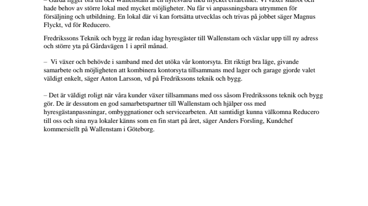 – Det är väldigt roligt när våra kunder växer tillsammans med oss såsom Fredrikssons teknik och bygg gör. De är dessutom en god samarbetspartner till Wallenstam och hjälper oss med hyresgästanpassningar, ombyggnationer och servicearbeten. Att samtidigt kunna välkomna Reducero till oss och sina nya lokaler känns som en fin start på året, säger Anders Forsling, Kundchef kommersiellt på Wallenstam i Göteborg.