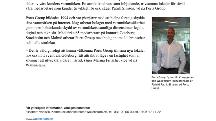 – Vi ser väldigt mycket fram emot vår flytt till nya, moderna lokaler i centrala Göteborg. Som bolag skyddar vi varumärken legalt, digitalt och tekniskt och skapar därmed varumärkessäkerhet inom alla delar av våra kunders varumärken. En attraktiv adress samt inbjudande, trivsamma lokaler för såväl våra medarbetare som kunder är viktigt för oss, säger Patrik Simson, vd på Ports Group.