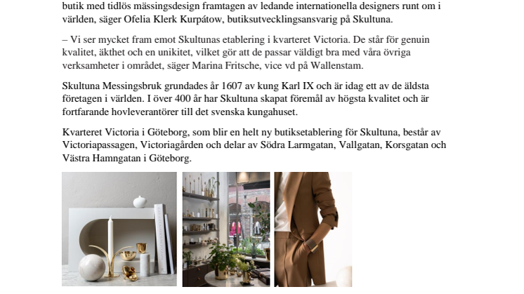 – Vi ser mycket fram emot Skultunas etablering i kvarteret Victoria. De står för genuin kvalitet, äkthet och en unikitet, vilket gör att de passar väldigt bra med våra övriga verksamheter i området, säger Marina Fritsche, vice vd på Wallenstam.