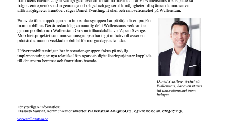 – Kundernas behov styr arbetet i innovationsgruppen tillsammans med insikter från bland annat en studie av framtidens boende. Jag är väldigt glad över att ha fått förtroende att driva Wallenstams fokus på dessa frågor, entreprenörsandan genomsyrar bolaget och jag ser alla möjligheter till spännande innovativa affärsmöjligheter framöver, säger Daniel Svartling, it-chef och innovationschef på Wallenstam.