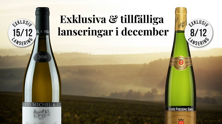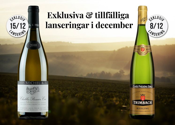 December bjuder på krispiga vita viner från två av Frankrikes mest välkända vindistrikt. En klassisk Riesling från Alsace och en uppskattad Chablis från hjärtat av regionen lanseras i december i Systembolagets tillfälliga och exklusiva sortiment.