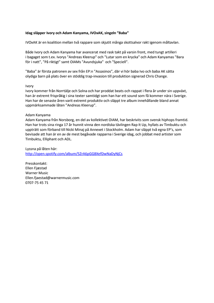 Idag släpper Ivory och Adam Kanyama, IVOxAK, singeln ”Baba”