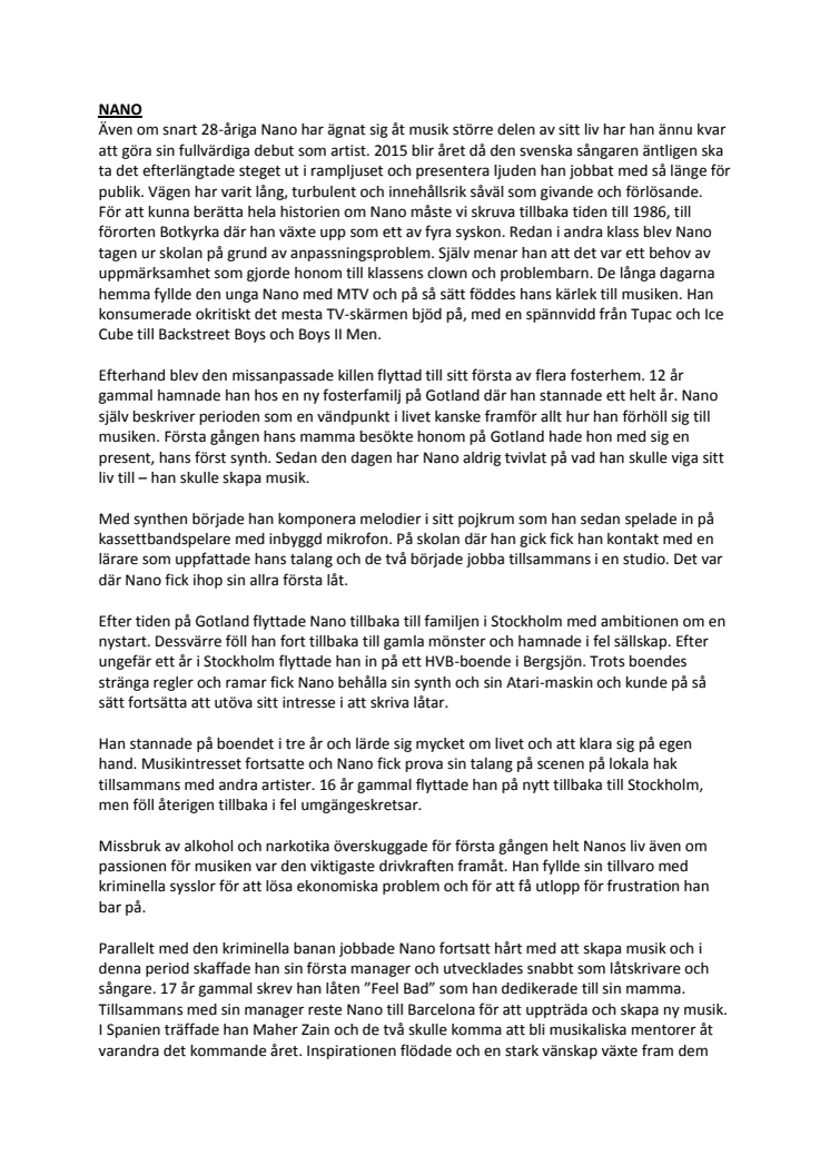 Nano är rösten och personen att hålla koll på 2015. Från ett trassligt förflutet har han nu bestämt sig för att vända blad och satsa helhjärtat på musiken. Nano har både en röst och en historia som berör – på djupet.