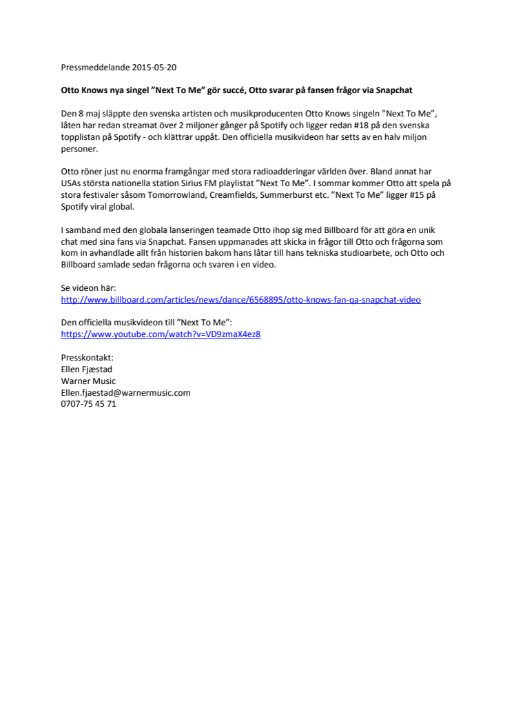 Otto Knows nya singel ”Next To Me” har redan streamat över 2 miljoner gånger på Spotify och ligger redan #18 på den svenska topplistan på Spotify. Den officiella musikvideon har setts av en halv miljon personer. I samband med den globala lanseringen teamade Otto ihop sig med Billboard för att göra en unik chat med sina fans via Snapchat.