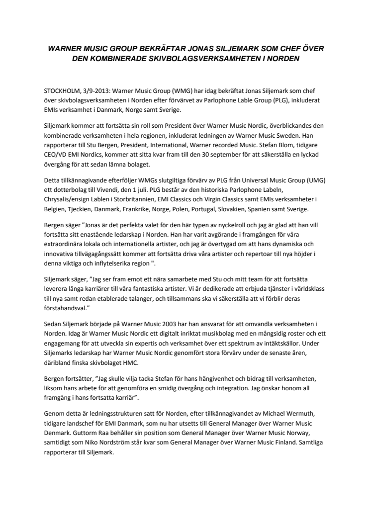 STOCKHOLM, 3/9-2013: Warner Music Group (WMG) har idag bekräftat Jonas Siljemark som chef över skivbolagsverksamheten i Norden efter förvärvet av Parlophone Lable Group (PLG), inkluderat EMIs verksamhet i Danmark, Norge samt Sverige.