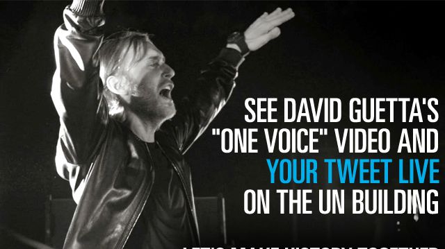 På en storbildsskärm bestående av FN’s huvudkontor(!) i New York kommer videon till David Guettas kommande singel One Voice att premiärvisas om ca 9 timmar. Detta kommer sedan förvandlas till världens största Twitterflöde där tweets från hela världen visas. Följ nedräkningen till start på David Guettas Facebook-sida där hela liveeventet kommer streamas i realtid.