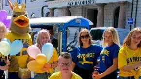 Eleverna som går i årskurs 1 på Fria Läroverken, hade till uppgift att uppmuntra affärer, caféer och restauranger till att dekorera sina verksamheter i blå-gult inför nationaldagen. De åkte runt i Lilla tåget och bjöd på godis, ballonger och en härlig stämning.