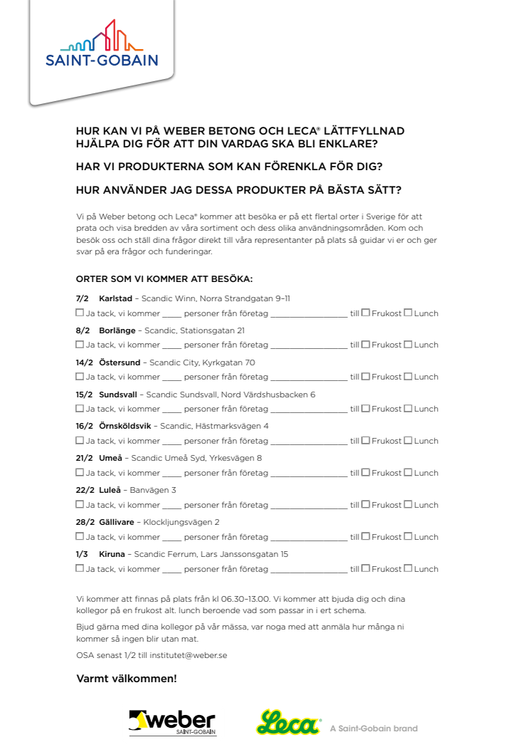 Vi på Weber betong och Leca® kommer att besöka er på ett flertal orter i Sverige under vintern för att prata om och visa bredden av våra sortiment och dess olika användningsområden.