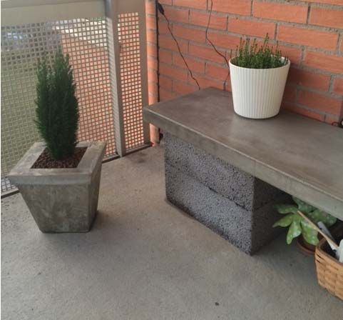 Estetisk och hållbar bänkskiva gjuten av weber exm 702. Bänkskivan är placerad på 4 lecablock. Bänken är placerad på en balkong och står ute året runt.