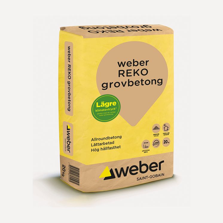 Weber REKO fin- och grovbetong är Webers första klimatförbättrade betongprodukter. Genom att delvis använda återvunnet torrbruk har man minskat behovet av ny råvara samtidigt som en del av cementhalten ersatts med alternativa bindemedel. Produkterna bevarar samma goda egenskaper och styrka som tidigare men har jämförelse med Webers ordinarie fin- och grovbetong lägre klimatpåverkan*.