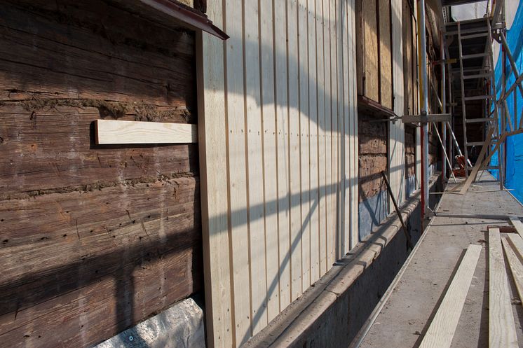 Den befintliga putsen på byggnaden var i mycket dåligt skick, därför görs en omputsning inifrån den ursprungliga timmersstommen. Precis som på 1790-talet används vassmatta som putsbärare, förutom på husets västra fasad där man har spiktegel utan armerande nät som putsbärare. Ytputsen blir brädriven slätputs som avfärgas med gotlandskalk med järnvitriol som pigment, vilket ger samma ljust gula fasadfärg som den ursprungliga fasaden hade.