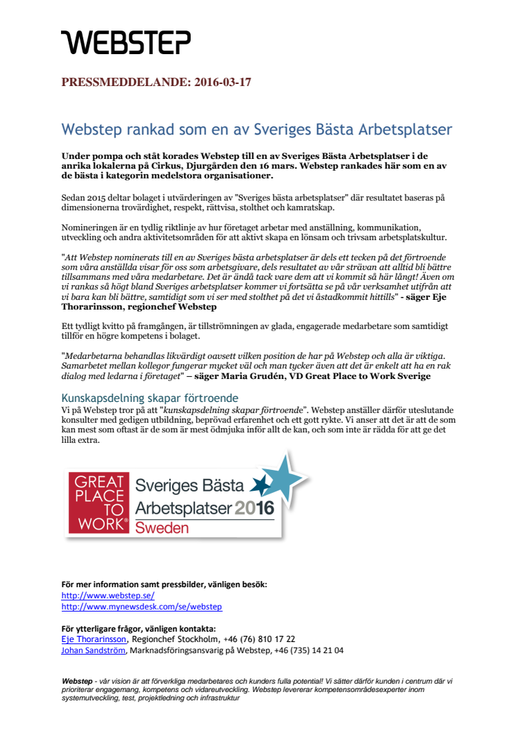 Webstep rankad som en av Sveriges Bästa Arbetsplatser