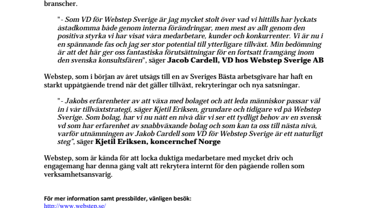 Som ett led i bolagets tillväxtstrategi axlar nu Jakob Cardell, tidigare CFO inom bolaget, rollen som VD för Webstep i Sverige. Bolagets koncernchef, Kjetil Eriksen lämnar därför posten efter två års tid för att istället koncentrera sig på den skandinaviska marknaden.