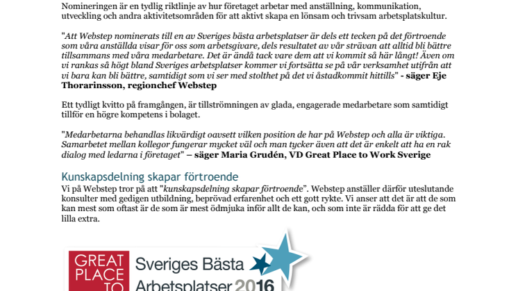 "Att Webstep nominerats till en av Sveriges bästa arbetsplatser är dels ett tecken på det förtroende som våra anställda visar för oss som arbetsgivare, dels resultatet av vår strävan att alltid bli bättre tillsammans med våra medarbetare. Det är ändå tack vare dem att vi kommit så här långt! Även om vi rankas så högt bland Sveriges arbetsplatser kommer vi fortsätta se på vår verksamhet utifrån att vi bara kan bli bättre, samtidigt som vi ser med stolthet på det vi åstadkommit hittills" - säger Eje Thorarinsson, Regionchef Webstep