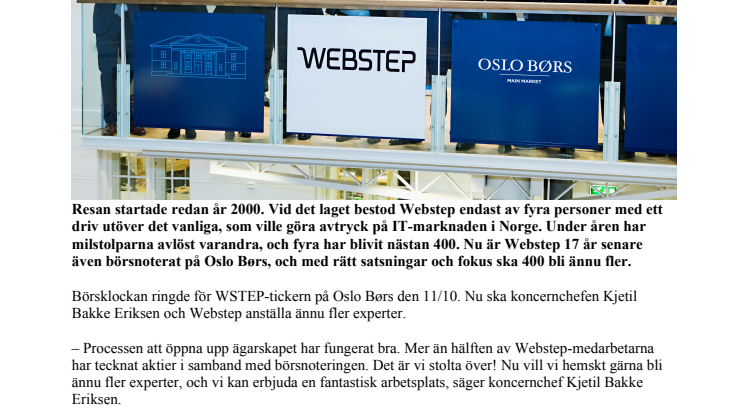 Webstep grundades år 2000, och sjutton och ett halvt år senare ringde börsklockan för företaget på Oslo Børs under tickern WSTEP. En speciell dag för företaget som växt från bara de fyra grundarna till nästan 400 anställda sedan starten. Sedan 2012 ingår även Sverige i Webstep koncernen.