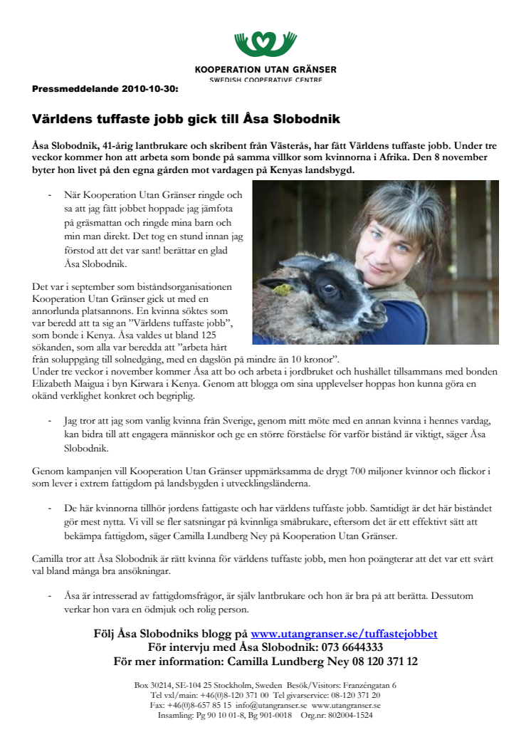 Åsa Slobodnik, 41-årig lammproducent och skribent från Västerås, har fått Världens tuffaste jobb. Under tre veckor kommer hon att arbeta som bonde på samma villkor som kvinnorna i Afrika. Den 8 november byter hon livet på den egna gården mot vardagen på Kenyas landsbygd.