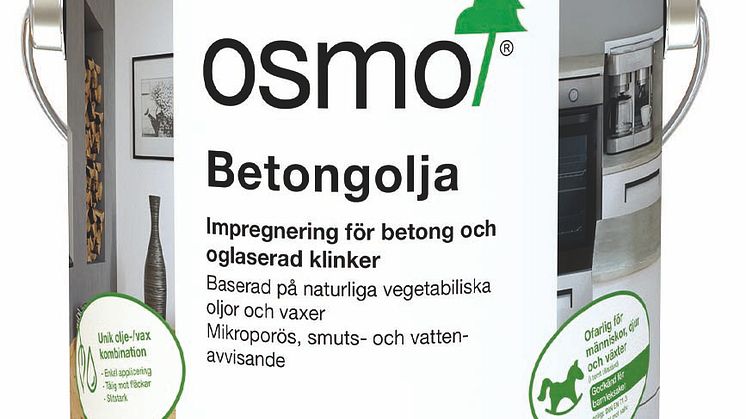 Nu finns äntligen en produkt för behandling av betong i Osmo sortimentet. Osmo 610 Betongolja är ofärgad, sidenmatt impregnering för betong, artificiell sten och oglaserad klinker inomhus. Baserad på naturliga vegetabiliska oljor och vaxer.