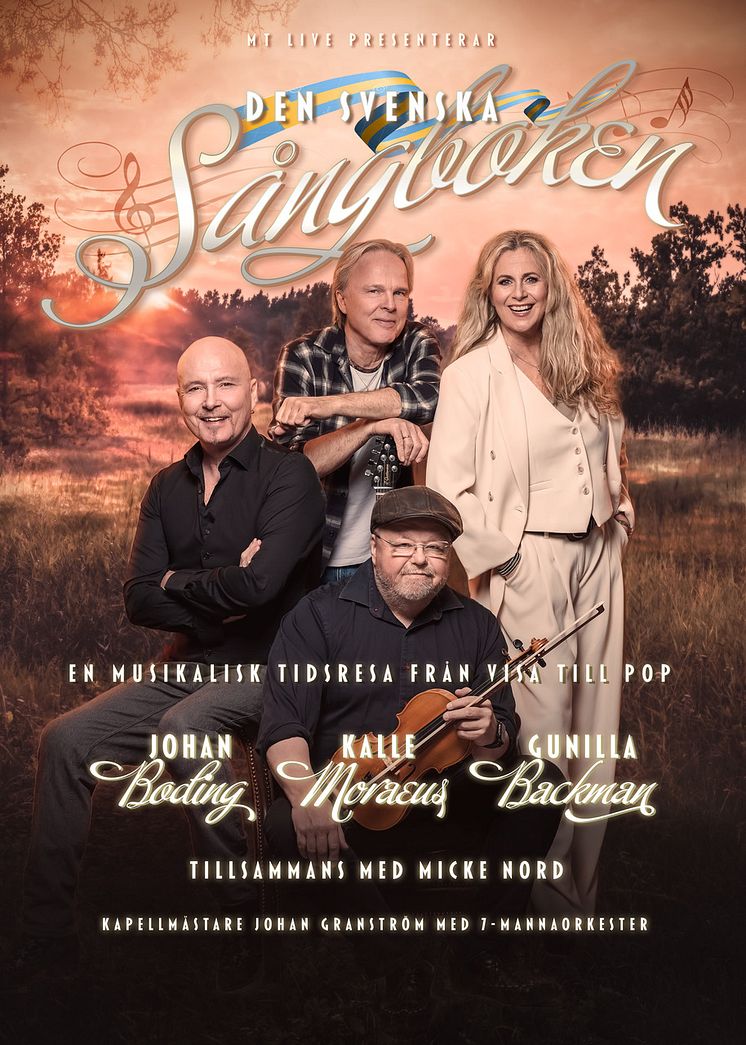 Den svenska musikskatten hyllas stort på turné av "Den Svenska Sångboken" med Kalle Moraeus, Gunilla Backman, Johan Boding och Mikael "Nord" Andersson - hösten 2024!
