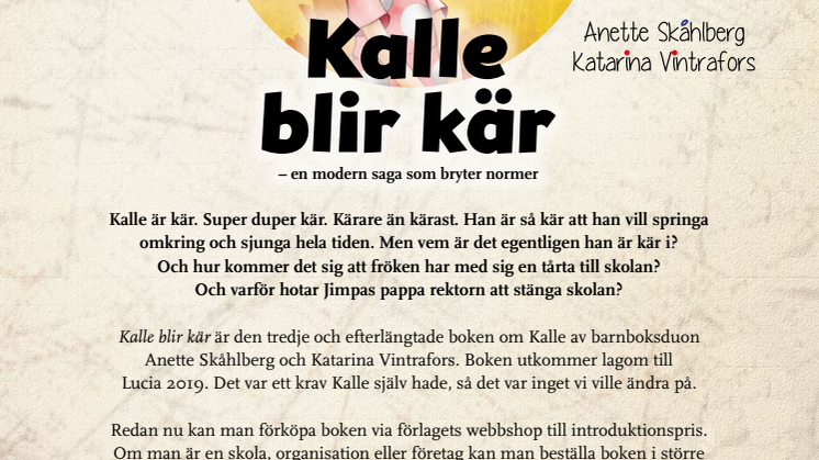 – Kalle ligger mig väldigt varmt om hjärtat, det är speciellt att få illustrera honom, och en extra spännande och rolig utmaning att få göra det igen efter så många år. Det var ju ett tag sedan Kalle som lucia släpptes, och vi har fått frågan många gånger sedan dess när nästa bok om Kalle är på väg. Vi har saknat Kalle och vet att boken är efterlängtad, och därför är det extra kul att nu kunna avslöja att nu är den snart här! Kalle är här igen på nya upptåg! Jag är lika glad och exalterad som Kalle själv, och ser SÅ mycket fram emot att få sprida Kalles kärlek! Låt devisen ”Låt alla få vara som de vill! Och älska de de vill!” klinga över landet.